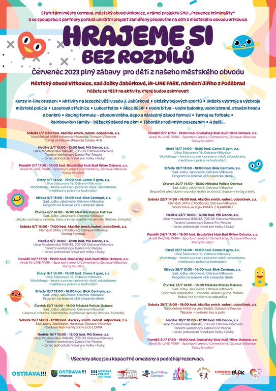 Hrajeme si bez rozdílů je zpět! Stejně jako v loňském roce získal náš obvod podporu z programu Prevence kriminality od Statutárního města Ostrava!!! - oficiální stránky a proto mohl uspořádat již 4. ročník této krásné akce. Děti a mládež z městského obvodu Vítkovice se v červenci mohou těšit na každodenní a různorodý program, který pro ně připravily zúčastněné organizace. Letos máme dokonce jednu novinku. KOMPLETNÍ PROGRAM NA CELÝ MĚSÍC NALEZNETE ZDE!